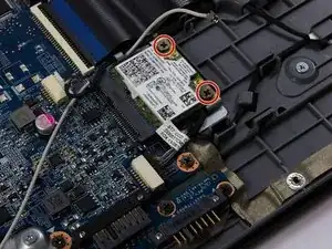 У модуля беспроводной сети два антеннных кабеля (чёрный и белый), подключённых к другим деталям ноутбука.