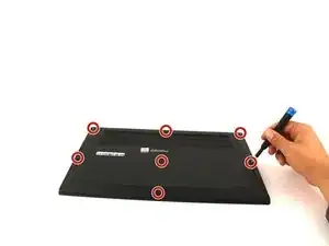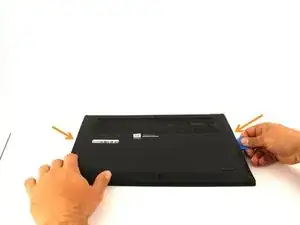 Протяните синюю открывалку вдоль боковой стороны ноутбука и подденьте по одному защёлке с каждой стороны.