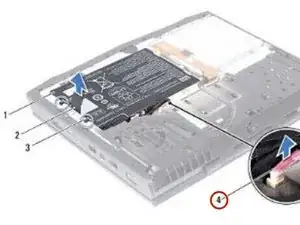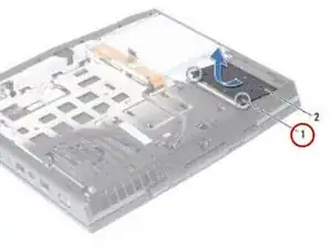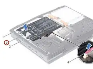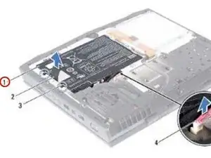 Ослабьте два захваченных винта, которыми аккумуляторный блок крепится к основанию компьютера.