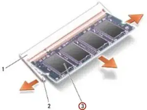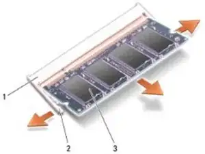 Используйте кончики пальцев, чтобы осторожно раздвинуть фиксирующие зажимы на обоих концах разъема модуля памяти, пока модуль не поднимется.