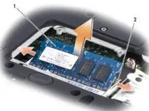 Осторожно раздвиньте фиксирующие зажимы на каждом конце разъема модуля памяти, пока модуль не поднимется.