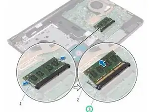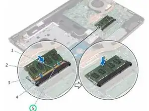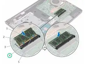 Вставьте модуль памяти под углом в разъём и сильно нажмите на модуль, пока он не защёлкнется на месте.