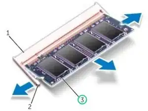 Используйте кончики пальцев, чтобы осторожно раздвинуть фиксирующие зажимы на каждом конце разъема модуля памяти, пока модуль памяти не поднимется.
