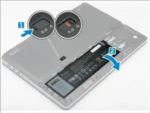 Переместите защелку разблокировки от значка разблокировки, чтобы разблокировать батарею [1].