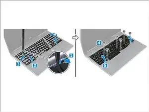 Используя пластиковую лопатку, отсоедините декор клавиатуры от нижней части и продвигайтесь вдоль верхнего края, чтобы снять его с компьютера [1, 2, 3].