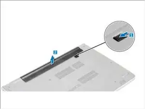 Сдвиньте защёлку разблокировки, чтобы разблокировать аккумулятор [1].