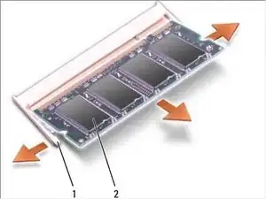 ВНИМАНИЕ: Чтобы избежать повреждения разъема модуля памяти, не используйте инструменты для рассеивания зажимов модуля памяти.