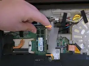 Найдите слот SODIMM в центре материнской платы; рядом с ним под клавиатурой должна находиться полупрозрачная бумажная вкладка, выделенная красным.