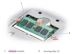 Если вы заменяете модуль памяти, извлеките существующий модуль, аккуратно раздвинув защёлки крепления по концам разъёма модуля памяти кончиками пальцев, пока модуль не приподнимется.