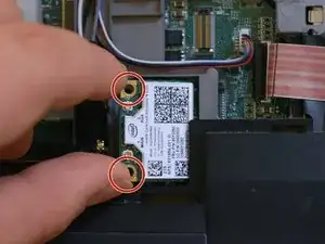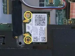Отверткой Phillips #00 выверните два винта, крепящие модуль WAN.