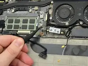 Пинцетом снимите шлейф, соединяющий модуль Wi‑Fi с материнской платой.