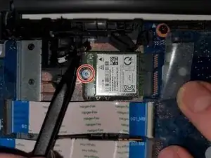 Отверткой Phillips #1 отверните винт 2,5 мм, который фиксирует модуль WLAN на материнской плате.