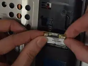 Край модуля, противоположный разъёму, приподнят над поверхностью компьютера.