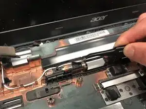 Аккуратно удалите две чёрные ленты, фиксирующие антенные кабели к нижней крышке, с помощью пинцета.