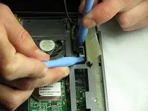 Используя меньшую лепёшку (например, PX3688), отогните крышку динамиков над кнопками «F2» и «Insert».