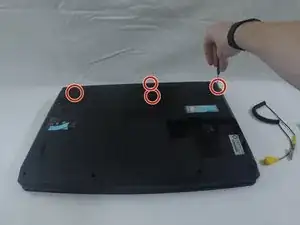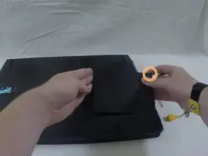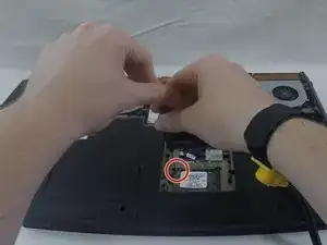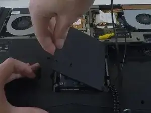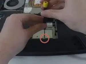 Снимите небольшую серебристую прямоугольную пластину под отсеkom жёсткого диска.