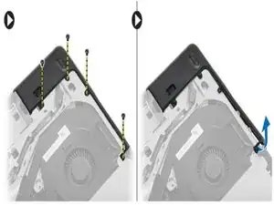 Удалите винты, которые фиксируют правую заглушку угла нижней крышки, поднимите и снимите её с корпуса компьютера.