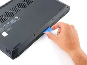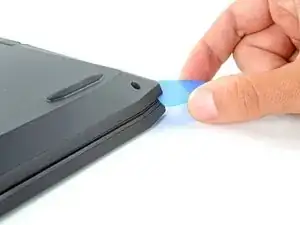 Вставьте пластиковую лопатку между нижней крышкой и шасси на переднем правом краю.