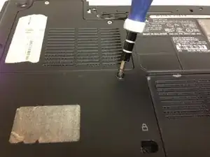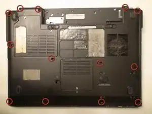 Найдите тринадцать винтов Phillips #1 длиной 10 мм, крепящих нижнюю панель ноутбука.