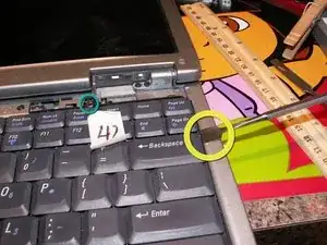Снимите два чёрных винта PH1 (большие) длиной 5 мм с верхнего края клавиатуры. На этом фото показан только правый винт.