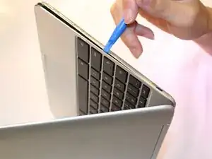 Используйте пластиковую вскрывающую инструмент, чтобы поддеть и снять панель клавиатуры.