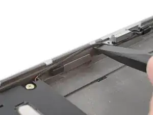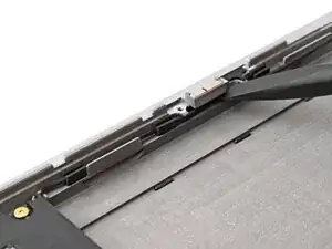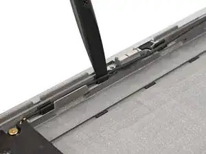 Используйте плоский конец отвертки Framework, чтобы вставить кабель динамика обратно в зажимы вдоль нижнего края ноутбука.
