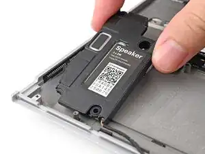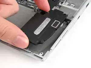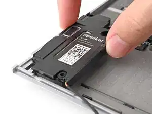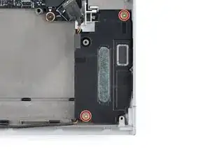 Используйте отвёртку Framework, чтобы снять два винта Torx T5 длиной 2.0 мм, крепящие каждый динамик (всего четыре).