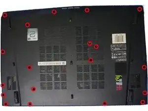 Затем переверните компьютер так, чтобы основание оказалось сверху. Удалите 19 крепежных винтов. Четыре снизу, четыре сверху, два с одной стороны, три с другой стороны и оставшиеся винты посередине, как показано.