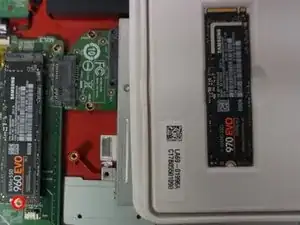 Удалите единственный крепежный винт, удерживающий текущий NVMe диск; здесь Samsung 960 EVO.
