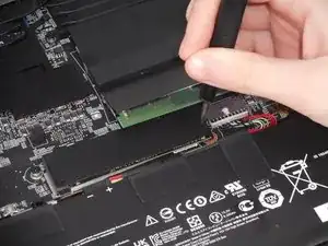 Поскольку NVME SSD напрямую подключён к материнской плате, при его замене потребуется доступ к плате. Если после замены накопитель по-прежнему не работает, может понадобиться полная замена материнской платы или установка более свежей версии Windows. Для выполнения замены потребуется крестовая отвертка Phillips J1.