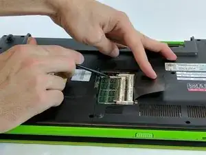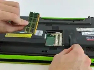 Найдите два разъема на обоих концах короткой стороны. Это освободит оперативную память, если всё сделано правильно, длинная сторона должна слегка приподняться.