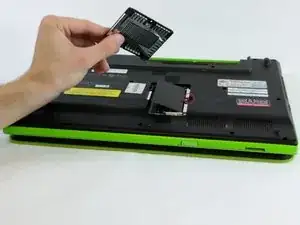 Переверните ноутбук вверх дном. Найдите съемную крышку, которая закреплена винтом в правом переднем углу ноутбука, находящегося в перевернутом состоянии.