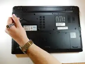 Переверните ноутбук, чтобы увидеть его нижнюю часть, и уложите его на ровную поверхность.
