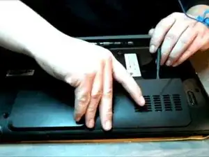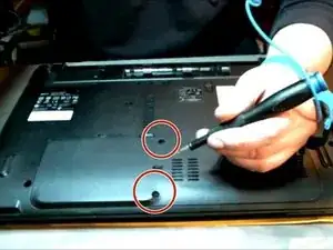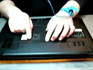 Убедитесь, что ваш компьютер выключен, и снимите батарею, используя защитные заклепки, показанные на изображении