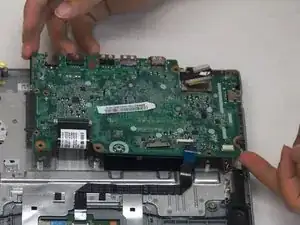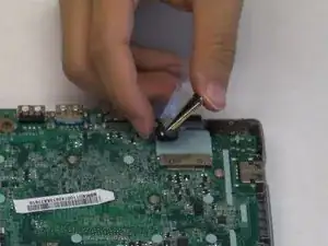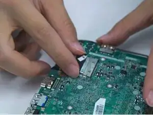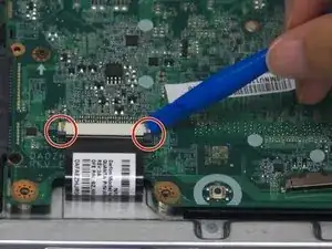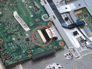Отклейте ленту, фиксирующую кабель дисплея к разъёму на материнской плате.