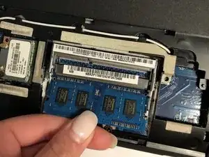 После удаления винта, отожмите вкладки по бокам модулей. Это позволит модулю оперативной памяти подняться, чтобы вы могли осторожно вытащить его. Повторите это для второго модуля памяти под ним.