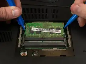 Нажмите на серебристые кнопки, удерживающие отсек для оперативной памяти, отводя их от модуля. Потребуется немного усилий. Отсек должен приподняться под углом.