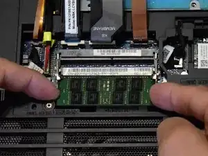 Найдите модули оперативной памяти возле края компьютера, ближайшего к Вам. Найдите маленькие защёлки по обеим сторонам модуля и нажмите на обе защёлки, чтобы освободить модуль. Аккуратно возьмите модуль за боковые стороны и потяните прямо наружу. Повторите для второго модуля.