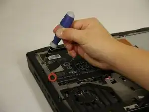 Ослабьте два винта Phillips размером 1 и длиной 6.35 мм, крепящих батарею к ноутбуку.