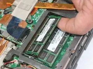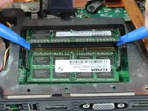 Отыскав оперативную память, аккуратно отогните два металлических зажима в стороны и поднимите планку оперативной памяти из гнезда.