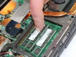 Чтобы установить новую оперативную память, положите ее сверху гнезда и аккуратно надавите вниз, пока она не щелкнет на место.