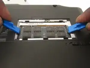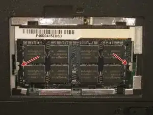 Чтобы освободить модуль оперативной памяти, одновременно отведите металлические защёлки по обеим сторонам. Это можно сделать с помощью пластиковых инструментов для вскрытия или пальцами.