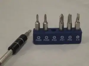 Возьмите адаптер для дисков и биту PH0 и с помощью отвертки выверните 5-миллиметровый винт из крышки отсека.
