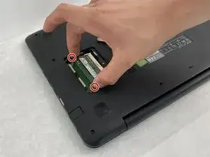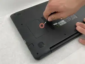 Переверните ноутбук, чтобы получить доступ к нижней стороне устройства. Удалите черный винт Phillips #0, который удерживает панель доступа к оперативной памяти на месте.