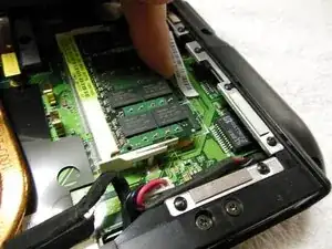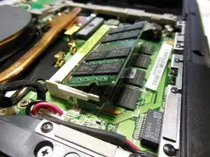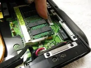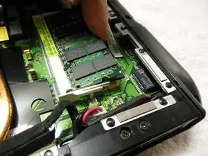 В нижней правой части вы увидите модуль памяти. Встроенная память ASUS K50IJ составляет 2 ГБ, и обычно в комплекте идёт модуль на 1 ГБ (=всего 3 ГБ). Максимально ноутбук поддерживает 4 ГБ, то есть можно установить только модуль на 2 ГБ (2 ГБ PC2-6400 DDR2).