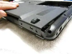 Установите нижнюю панель обратно на ноутбук, как показано. Затем слегка сдвиньте её назад в исходное положение.