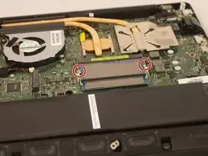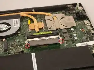 Отведите металлические защёлки в стороны от каждой кромки модуля оперативной памяти, находящегося ближе к аккумулятору, чтобы второй модуль выскочил.