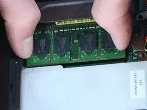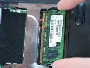 Найдите чип оперативной памяти и две металлические вкладки, удерживающие его на месте.