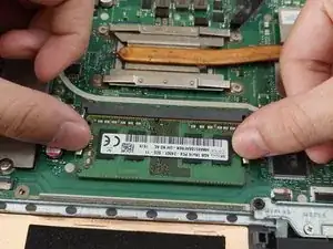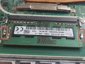 Для извлечения аккуратно отведите металлические защёлки по бокам модуля памяти наружу. Модуль слегка приподнимется.