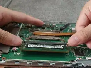 Аккуратно вставьте новый модуль памяти в слот под углом и надавите, пока металлические защёлки по бокам не защёлкнутся.